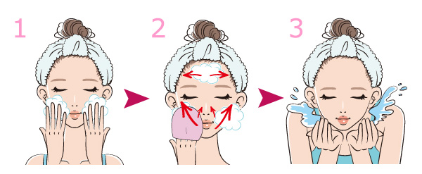 洗顔時、通常に石けんや洗顔料を使って洗顔をした後、洗い流す前に濡らして柔らかくした「絹の肌 洗顔パフ」で泡を拭き取るような感覚でお肌の上を撫でてください。